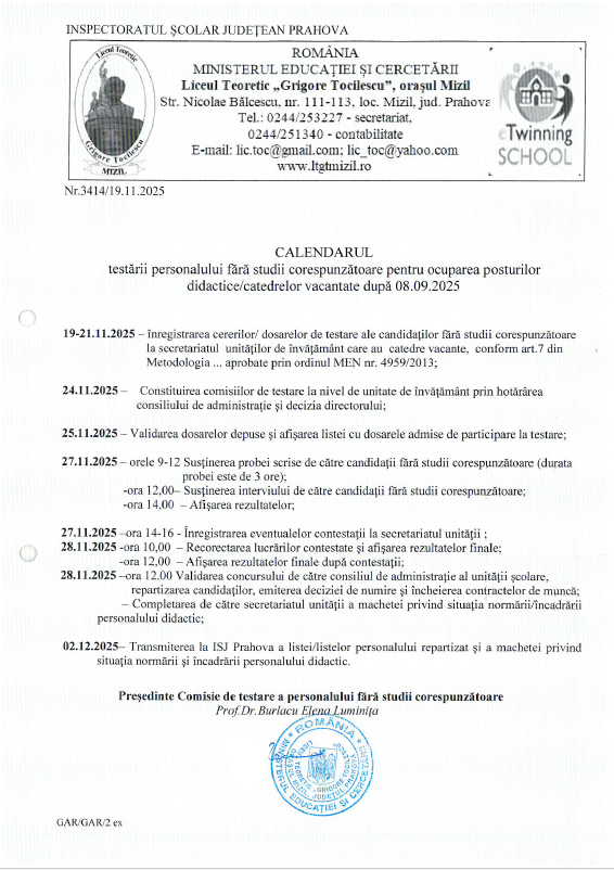 24.11.2025 – Constituirea comisiilor de testare la nivel de unitate de învățământ prin hotărârea consiliului de administrație și decizia directorului;
